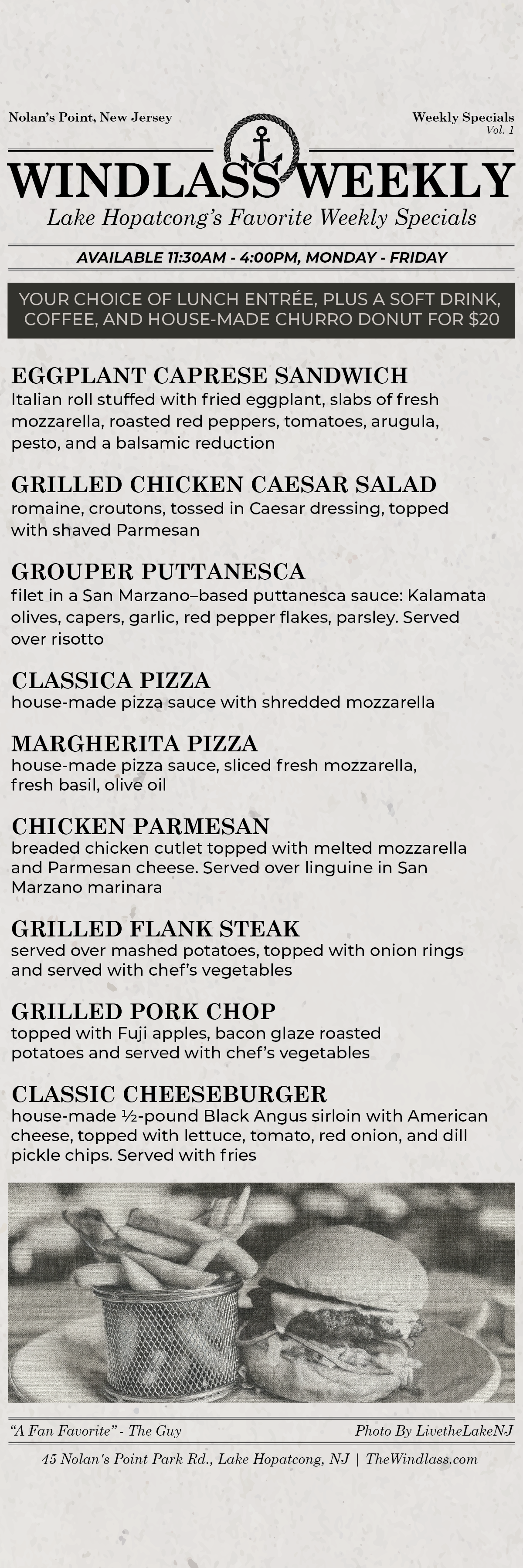 Step aside, brown-bag lunches, there’s a new midday tradition at the lake. The Windlass has launched its $20 Lunch Special, available Monday through Friday from 11:30 AM to 4:00 PM. Guests can enjoy a lunch entrée, a soft drink or fresh-brewed coffee, and a house-made churro donut for dessert. This new special is more than just a meal, it’s a reason to take a break by the lake and savor a touch of comfort with a hint of indulgence.