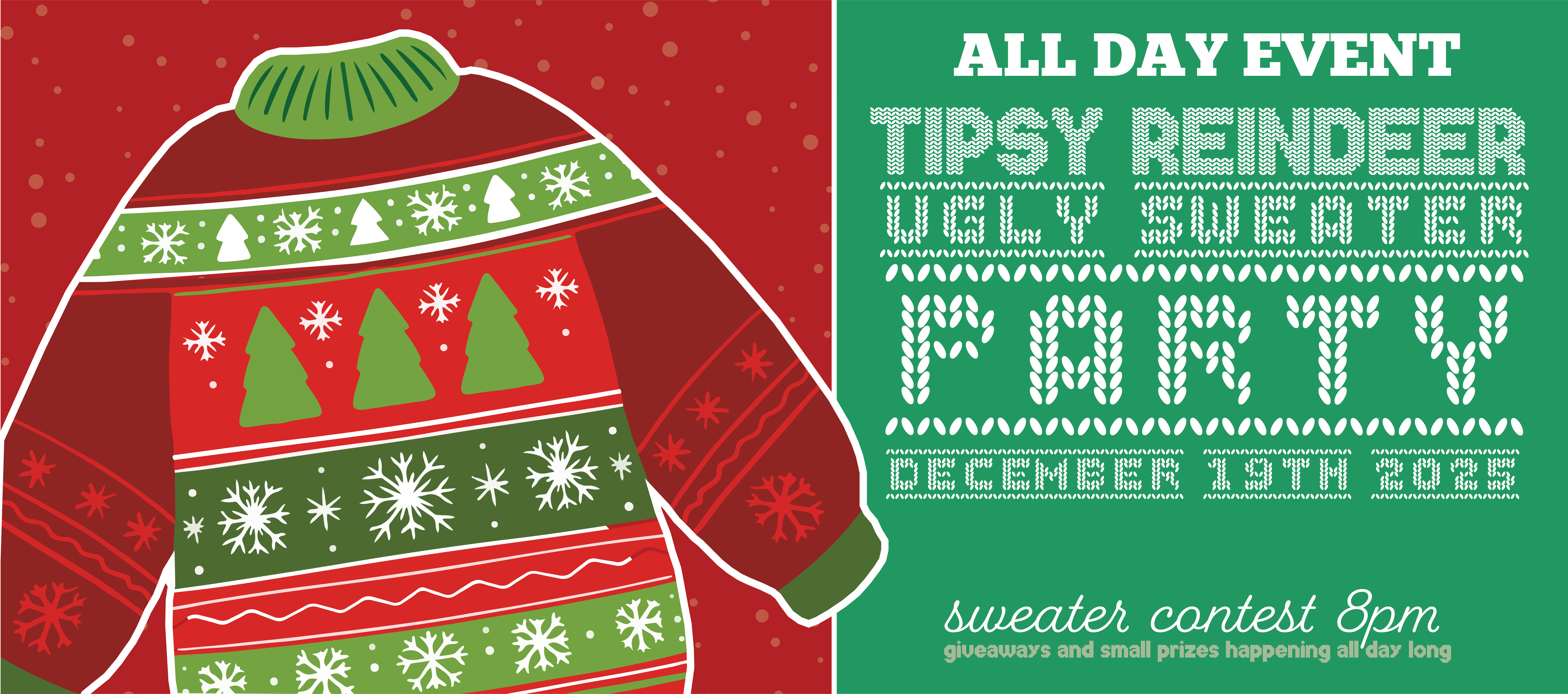 Do your worst on Friday, December 19th at The Tipsy Reindeer. The party kicks off at 4pm and rolls through 11pm, with our official Ugly Sweater Contest at 8pm!